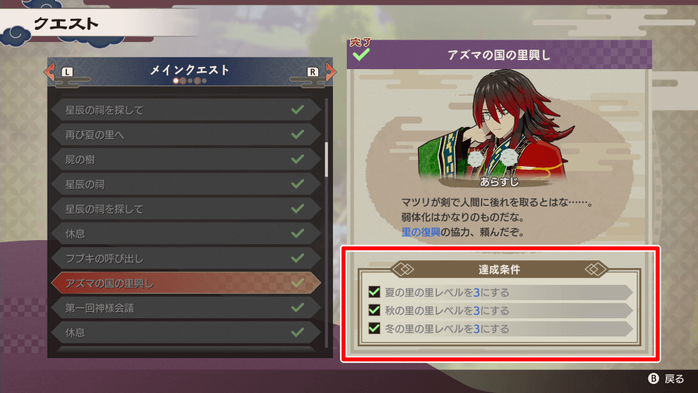 春・夏・秋・冬の里を解放後、すべての里レベルを3にするメインクエストが発生する。里レベルを上げないとストーリーが進められないため、最低でもレベル3までは里レベルを上げよう。