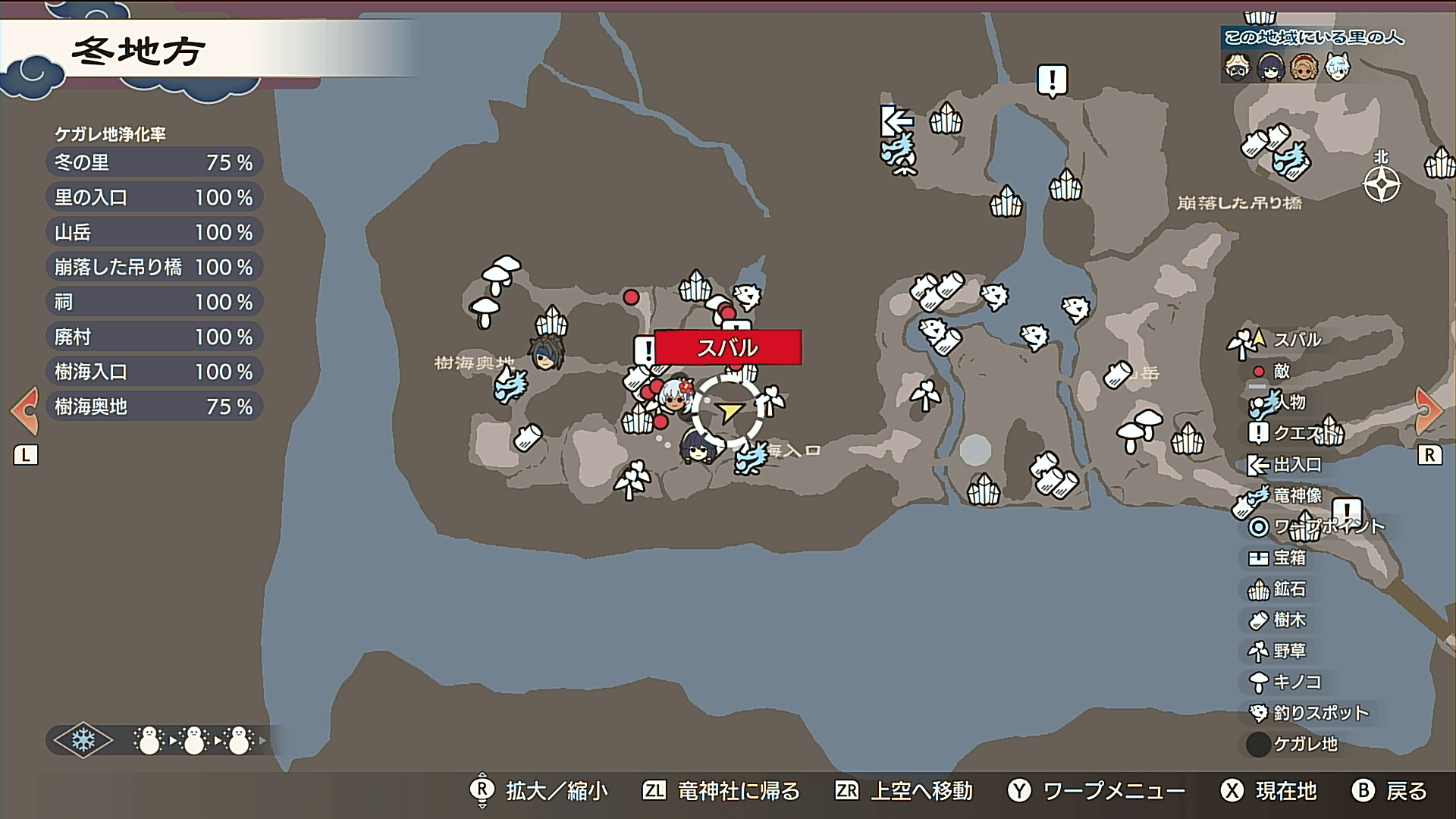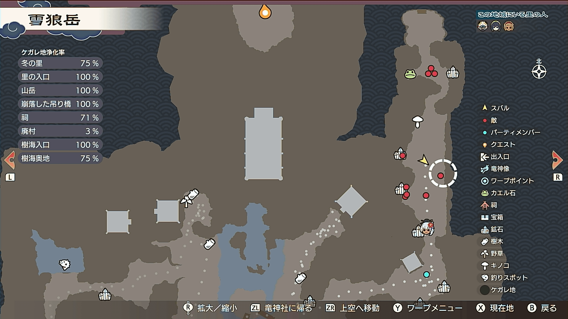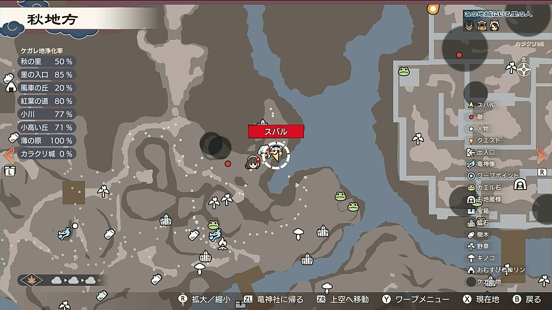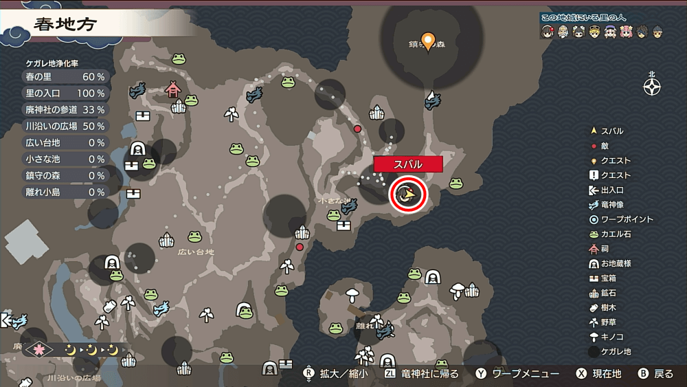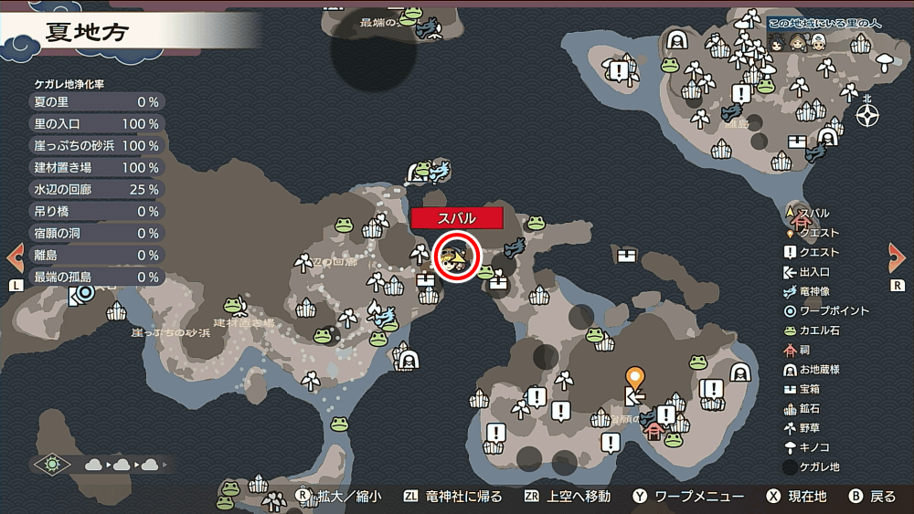 ヨイチの的は、カエル石や地蔵の掃除、ケガレの除去など他の収集要素をこなすついでに一緒に探すと効率的だ。カエル石などはマップ全体に配置されているので、回収していくと自然と的も見つかる。