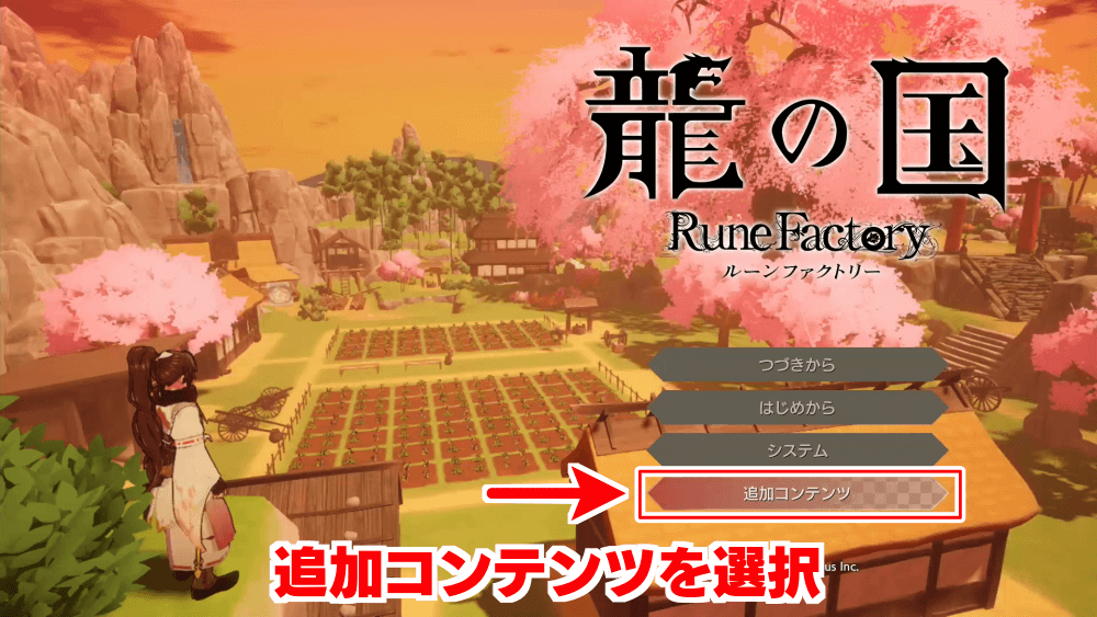 サクナヒメを仲間にするには、まずタイトル画面から追加コンテンツを選択し、ニンテンドーeショップを開こう。ゲーム画面から開くと、自動的に龍の国のコンテンツが表示されるため、ショップで探す手間を省ける。