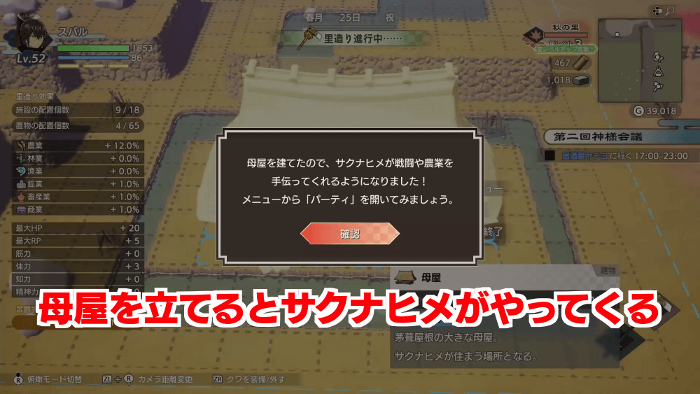 クエストを受注して母屋を入手したら、開拓エリアの好きな場所に母屋を配置しよう。母屋を建てると、里の中にサクナヒメが現れるようになる。また、母屋が里に建っている間は、サクナヒメをパーティに編成することも可能だ。