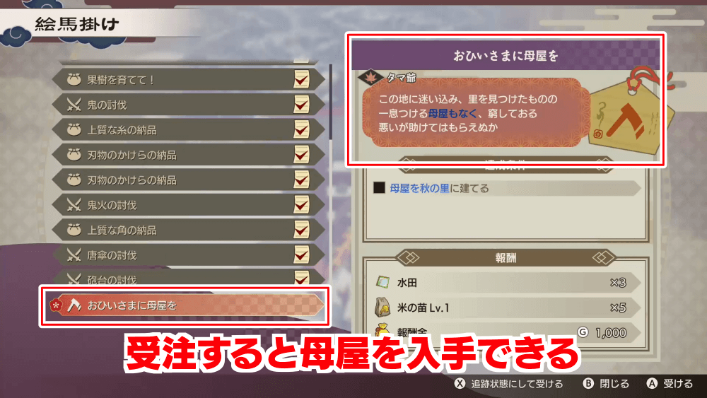 ゲームを起動したら、絵馬掛けを調べてコラボクエストを受注しよう。受注すると、サクナヒメを呼ぶために必要な母屋を入手できる。クエストが発生していない場合は、ストーリーを秋の里のメインクエスト「神輿探し」まで進めよう。