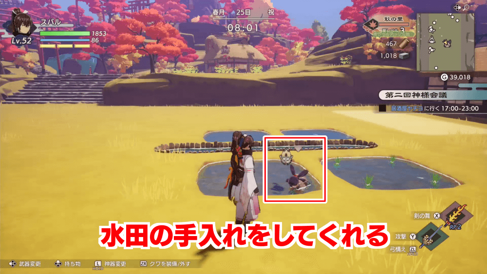 サクナヒメは、里にある水田の世話もしてくれる。開拓エリアに水田を設置して、サクナヒメに農業を手伝ってもらおう。