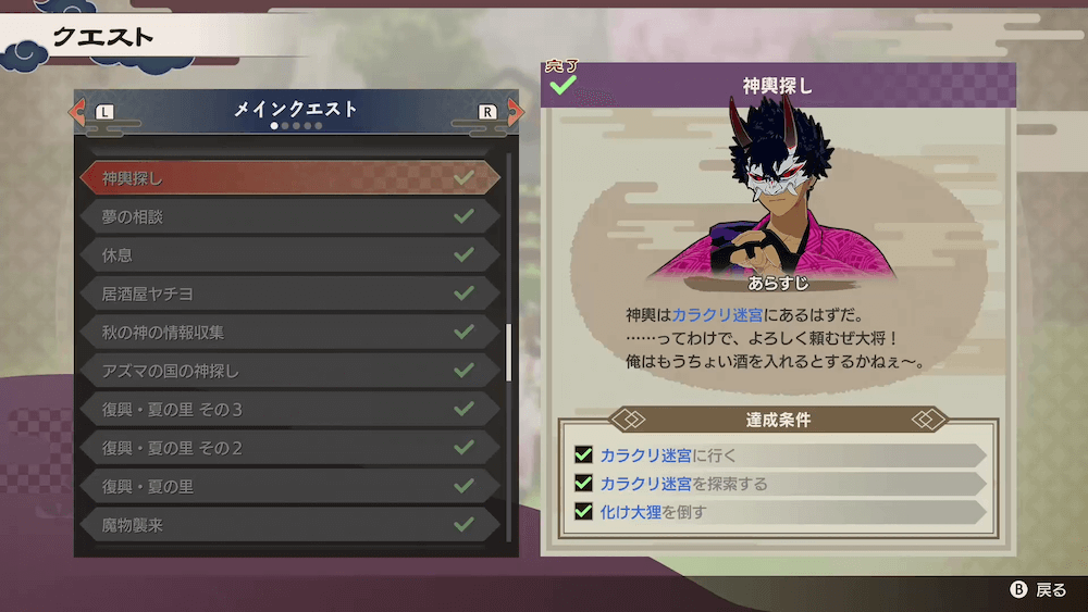 サクナヒメを里に呼ぶには、ストーリーを秋の里のメインクエスト「神輿探し」クリアまで進める必要がある。まだ秋の里まで行っていない場合は、ストーリーを秋の里まで進めよう。