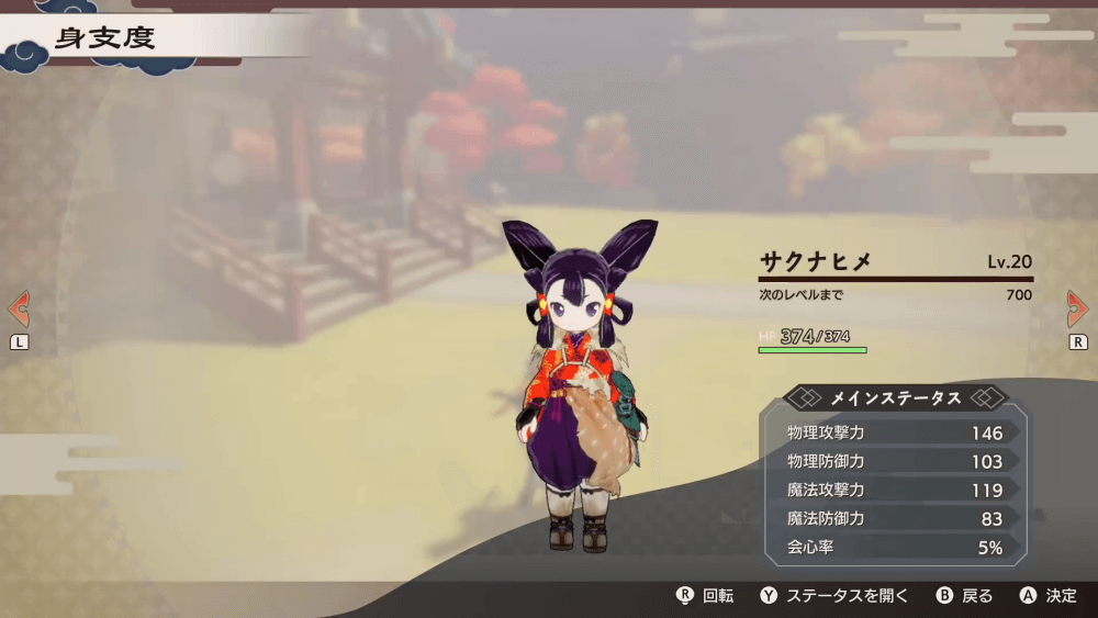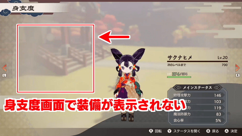 サクナヒメは、他のキャラと異なり装備を変更できない。防具や装飾品は装備できず、武器も変更できないため、装備品を用意する必要はない。
