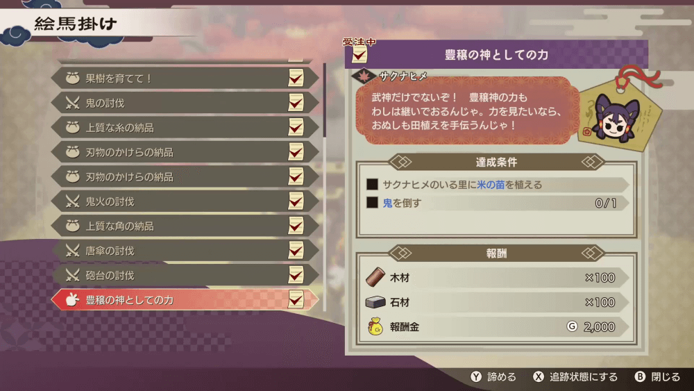 サクナヒメコラボの追加コンテンツを導入すると、絵馬掛けにコラボクエストが追加される。簡単な内容で報酬を貰えるため、ダウンロードしたら忘れずにクエストも達成しておこう。