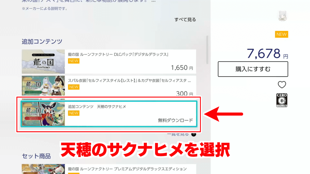 ニンテンドーeショップを開いたら、「追加コンテンツ 天穂のサクナヒメ」を選択してダウンロードしよう。無料でダウンロードできるため、課金をする必要は無い。