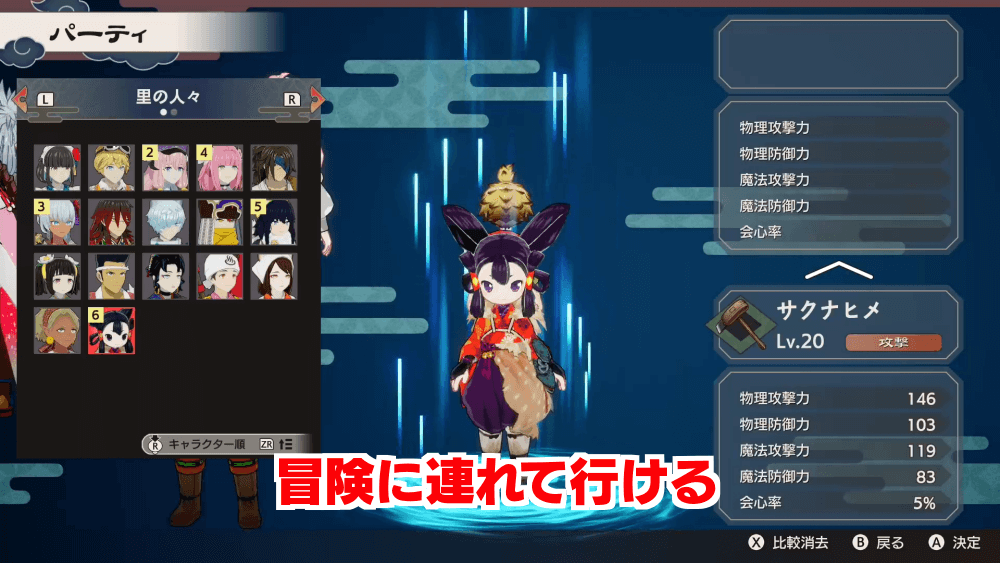 サクナヒメコラボの追加コンテンツを導入すると、サクナヒメをパーティに加えて冒険が可能だ。装備や見た目は変更出来ないが、冒険に連れて行けば一緒に戦ってくれる。