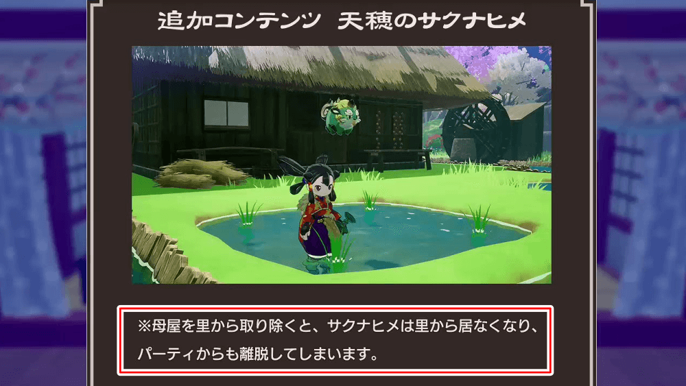開拓エリアから母屋を取り除くと、サクナヒメは里から居なくなり、パーティからも離脱してしまう。サクナヒメが居なくなってしまった時は、母屋を取り除いていないか確認しよう。