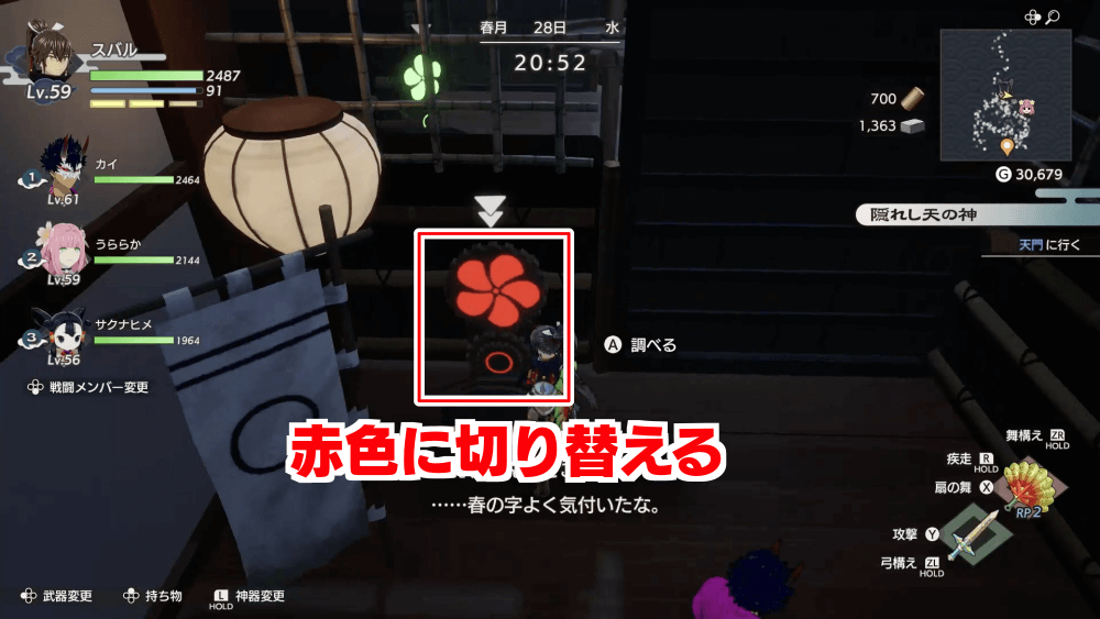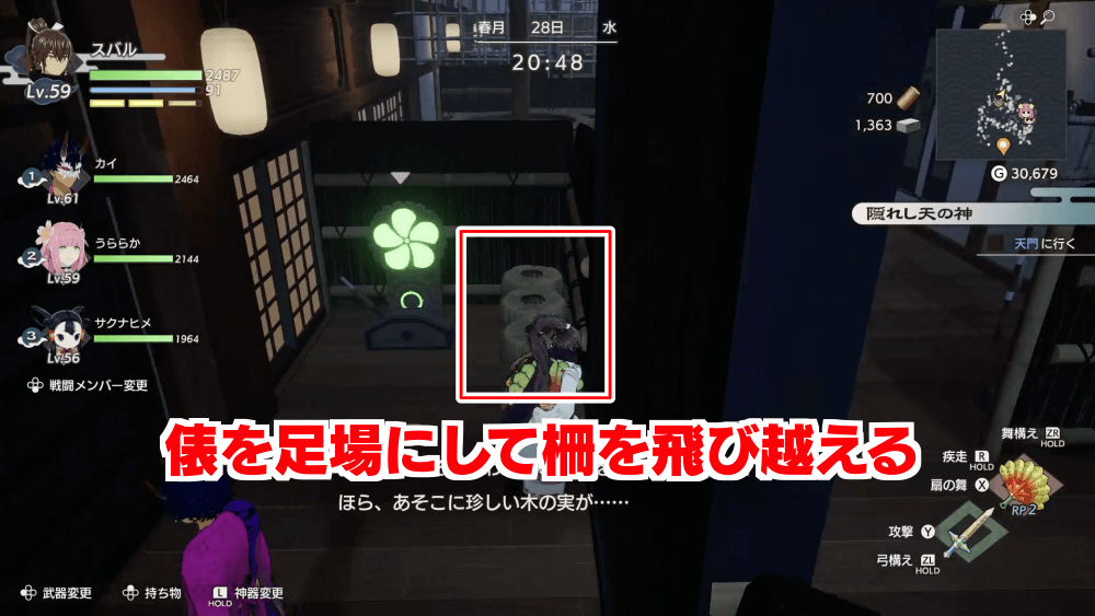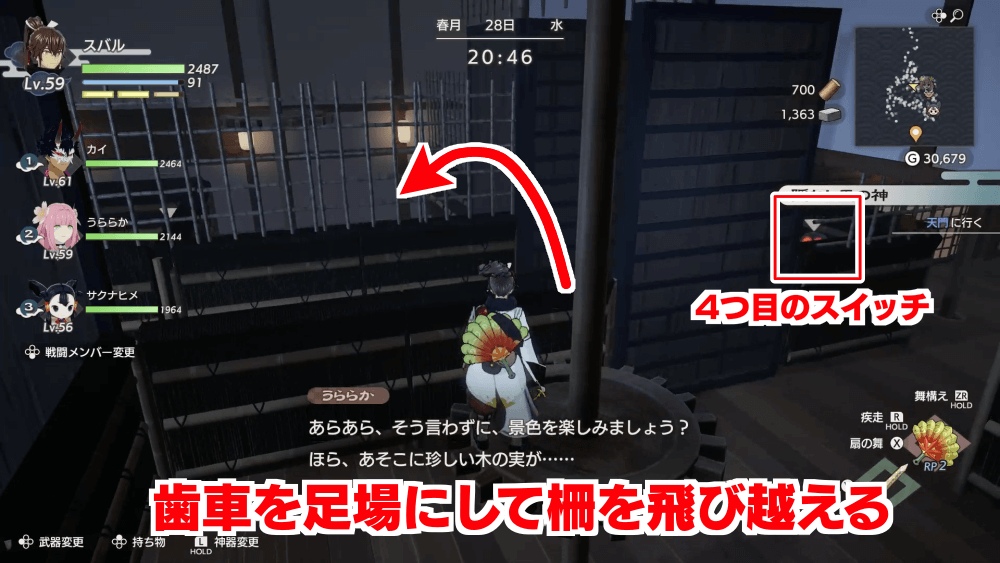 4つ目のスイッチを切り替えたら、横にある俵を足場にしてジャンプで柵を飛び越えよう。スイッチの後ろ側へ飛び越えると、1つ目のスイッチの横に出る。