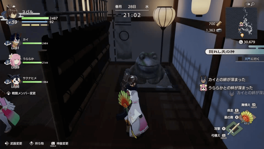 ワープした場所から奥へ進むとカエル石があり、絆の舞を奉じると「金の腕輪のレシピ」を入手できる。戻る時は、木の歯車型の足場を調べてワープしよう。