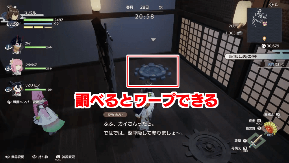 道中にあるスイッチには触らず、部屋の左奥まで進もう。部屋の左奥に石で出来た歯車型の足場があるので、調べると同じ足場がある場所にワープができる。