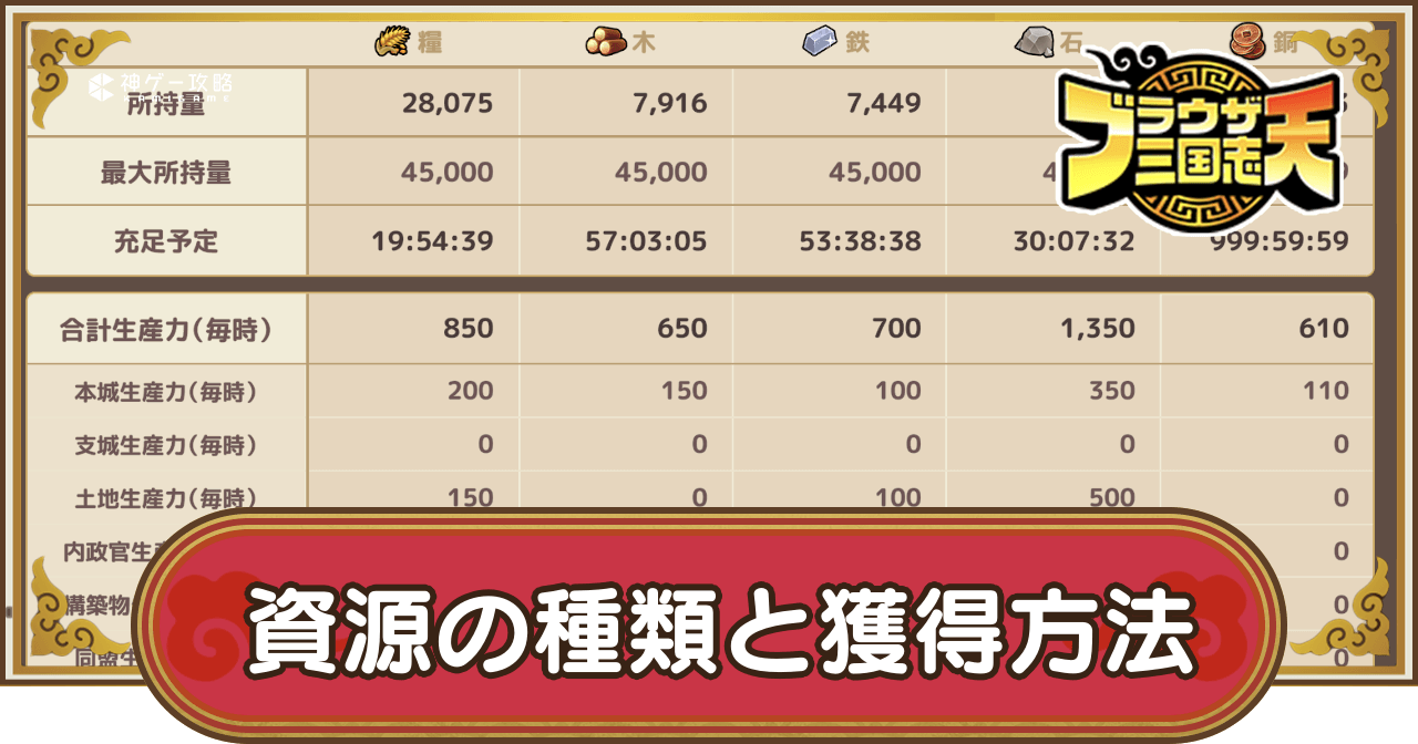 資源には「糧・木・鉄・石・銅」の5種類がある。資源は主に練兵や建造に使用でき、銅は銅銭ガチャや福引を引いたり、武将のスキルポイント化や鍛冶などを行う際に使用する。資源は生産力があれば時間経過で増加していくため、資源を集めたい場合は生産力を上げよう。