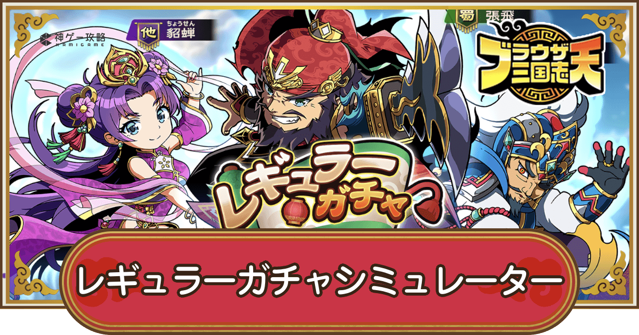 ブラウザ三国志天(ブラ天)のレギュラーガチャシミュレーターを掲載。単発や10連、好きなキャラが出るまで回せるガチャシミュレーターを掲載しているので、ガチャを引く前の運試しにどうぞ。