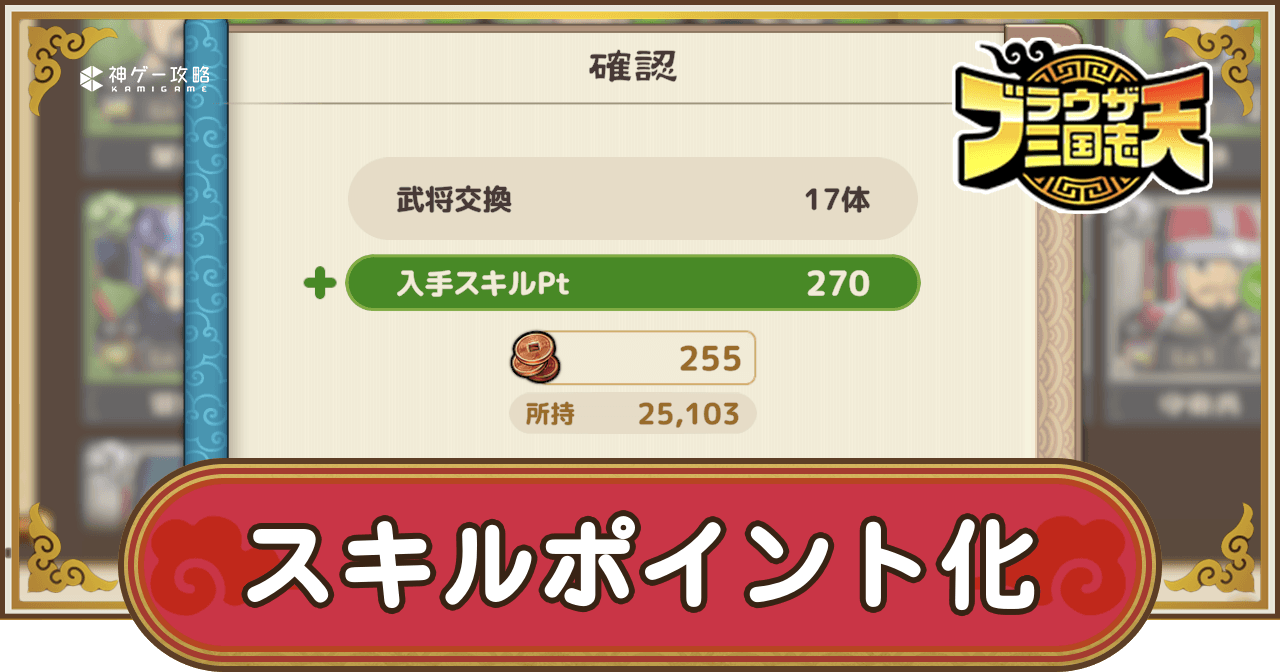 金貨/宝玉:5星4 120 星3 30 星2 20 星1 10 スキルポイント化は、武将のレア度によって入手できるポイントの量が異なる。レア度が高いほど入手できるポイントが多いため、スキルポイント化する武将を選ぶ時の参考にすると良い。