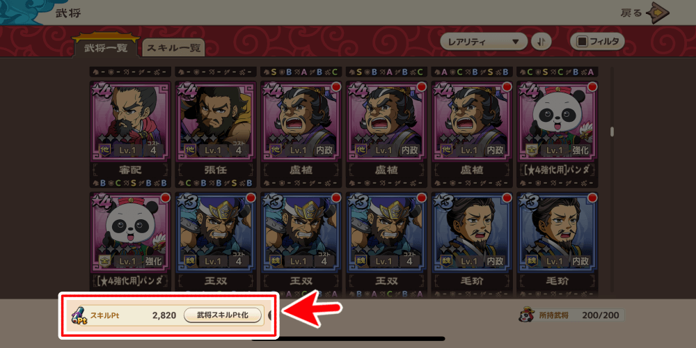 スキルポイントは、スキルポイント化で入手できる。ガチャで入手して重複した武将や、部隊の編成や内政官などに使わない武将をスキル化すると良い。また、レア度が低い武将は使い道も少ないため、武将の数が増えてきたらスキルポイント化してしまおう。