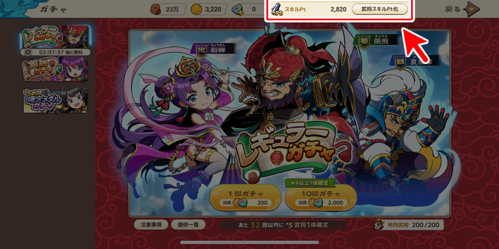 武将一覧画面 ガチャ画面 スキルポイント化をするには、武将一覧画面かガチャ画面にある「武将スキルPt化」のボタンをタップしよう。武将一覧画面では左下、ガチャ画面では画面上部に設置されている。