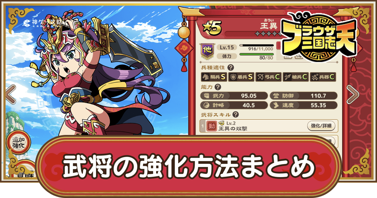 ブラウザ三国志天(ブラ天)の武将の強化方法を紹介。武将の強化方法だけでなく内政で武将を強化する方法についても掲載しているため、ブラウザ三国志天で武将の強化方法について知りたい時の参考にどうぞ。
