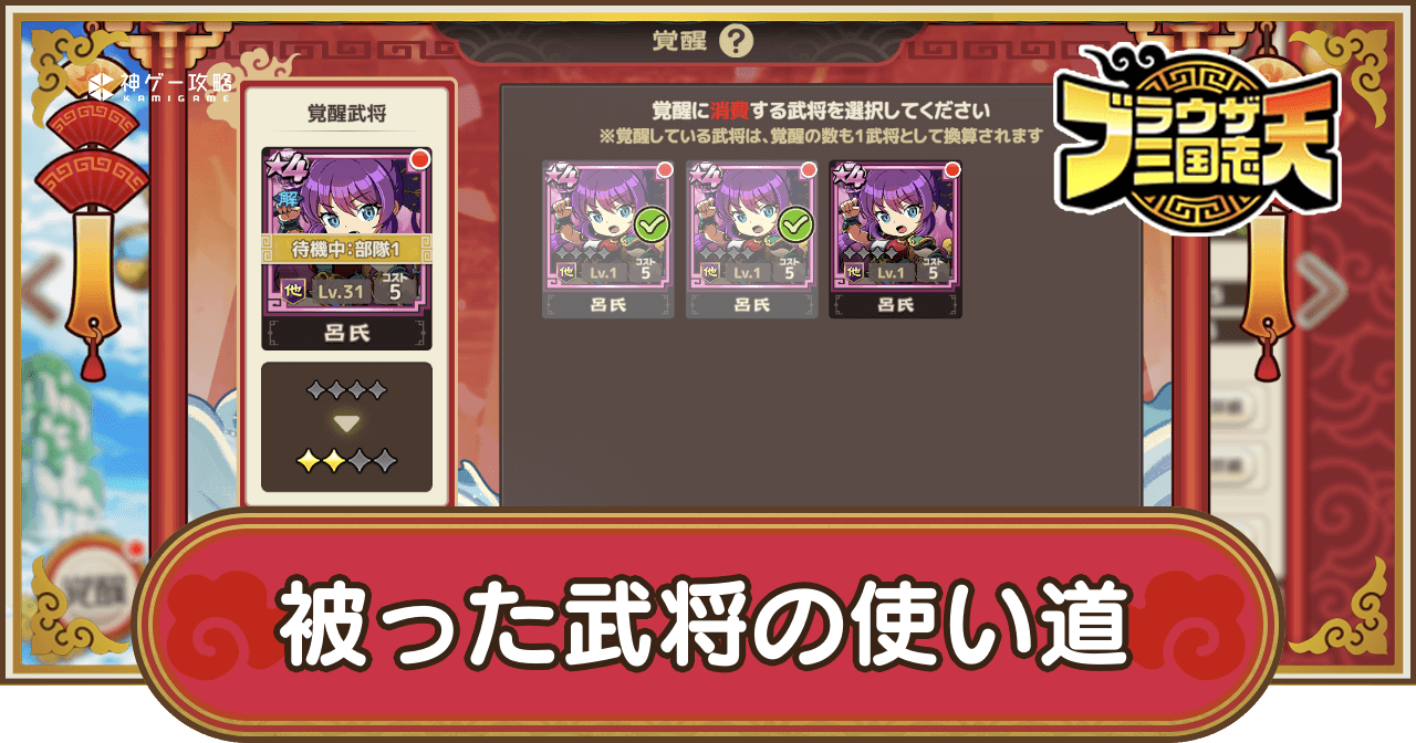 ブラウザ三国志天(ブラ天)の被った武将の使い道を紹介。被った武将の使い道の優先度や武将の入手方法についても掲載しているため、ブラウザ三国志天で被った武将の使い道について知りたい時の参考にどうぞ。