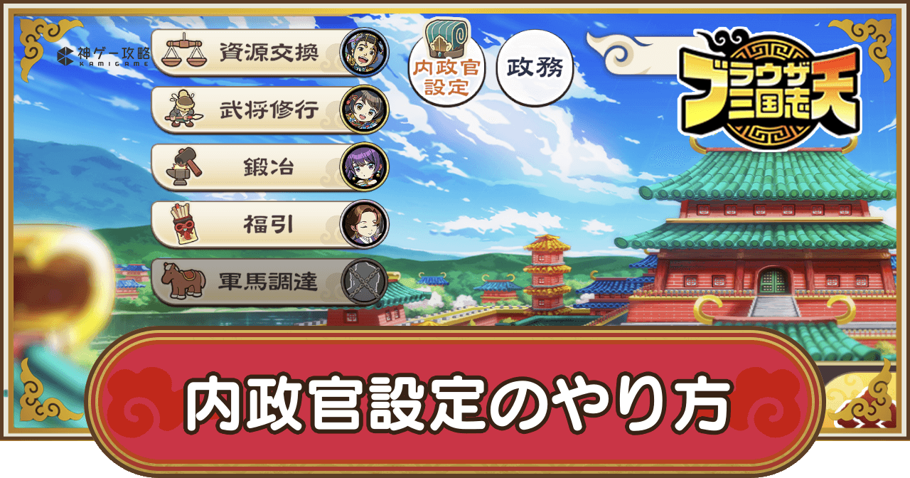 ブラウザ三国志天(ブラ天)の内政官設定のやり方を紹介。内政官の設定方法や内政官を選ぶコツに加え、内政官の解放条件や効果についても掲載しているため、ブラウザ三国志天で内政官について知りたい時の参考にどうぞ。