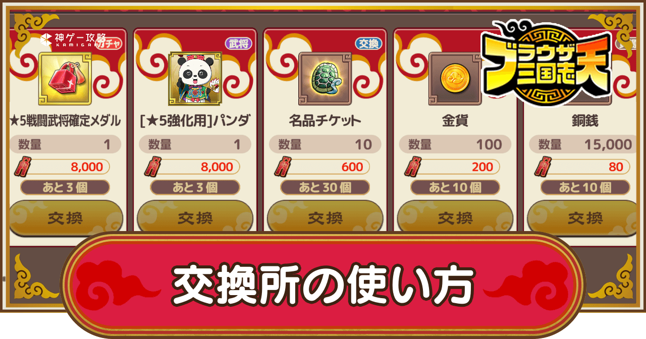 ブラウザ三国志天(ブラ天)の交換所の使い方とおすすめアイテムを紹介。交換所の開き方や購入できるアイテム一覧についても掲載しているため、ブラウザ三国志天で交換所の使い方を知りたい際の参考にどうぞ。