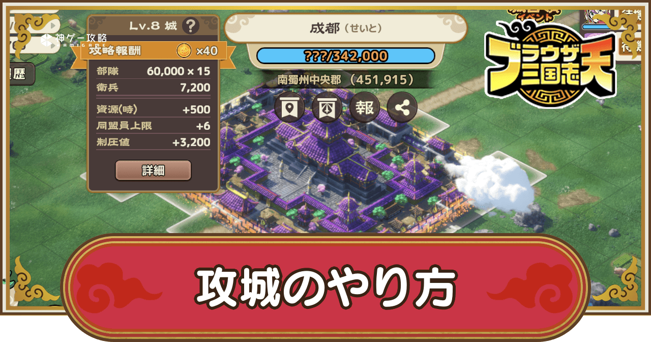 ブラウザ三国志天(ブラ天)の攻城のやり方を紹介。攻城のコツや注意点、城・関・埠頭を占領するメリットについても掲載しているため、ブラウザ三国志天で攻城を進める際の参考にどうぞ。