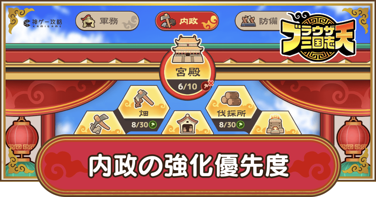 ブラウザ三国志天(ブラ天)の内政の強化優先度を紹介。各施設の主な効果や建造時の注意点についても掲載しているため、ブラウザ三国志天で内政の建造を進める際の参考にどうぞ。