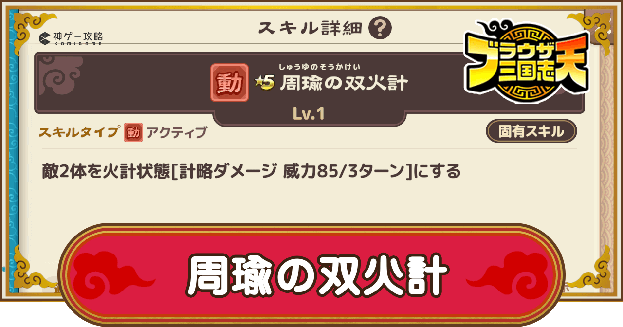 ブラウザ三国志天(ブラ天)の周瑜の双火計の効果と所持武将を掲載。詳細な効果はもちろん、固有スキルやスキル化で所持している武将についても掲載しているため、ブラウザ三国志天で周瑜の双火計について知りたい時の参考にどうぞ。