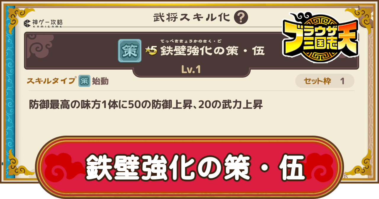 ブラウザ三国志天(ブラ天)の鉄壁強化の策・伍の効果と所持武将を掲載。詳細な効果はもちろん、固有スキルやスキル化で所持している武将についても掲載しているため、ブラウザ三国志天で鉄壁強化の策・伍について知りたい時の参考にどうぞ。