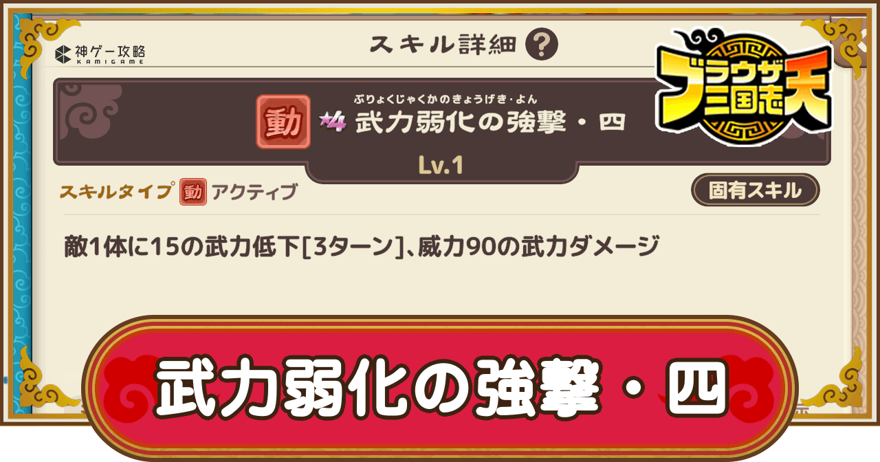 | 【Lv1】 敵1体に15の武力低下[3ターン]、威力90の武力ダメージ【Lv10】 敵1体に30の武力低下[3ターン]、威力180の武力ダメージ |