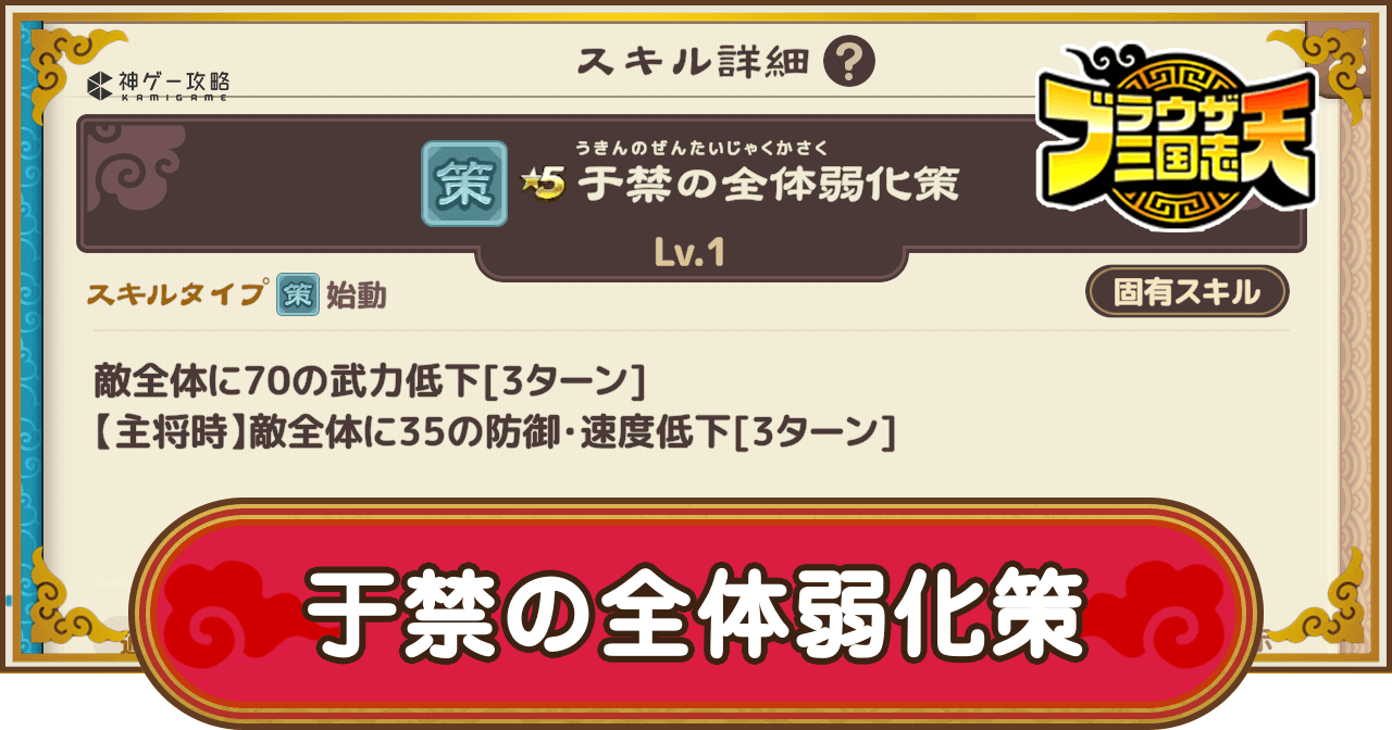 ブラウザ三国志天(ブラ天)の于禁の全体弱化策の効果と所持武将を掲載。詳細な効果はもちろん、固有スキルやスキル化で所持している武将についても掲載しているため、ブラウザ三国志天で于禁の全体弱化策について知りたい時の参考にどうぞ。