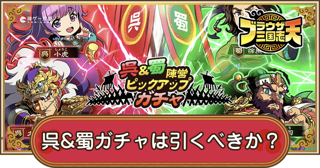 ブラウザ三国志天(ブラ天)の呉&蜀ピックアップガチャは引くべきか?を紹介。呉と蜀陣営で狙うべき武将や、ガチャの開催期間についても掲載しているため、ブラウザ三国志天で呉&蜀陣営ガチャを引くべきかについて知りたい際の参考にどうぞ。