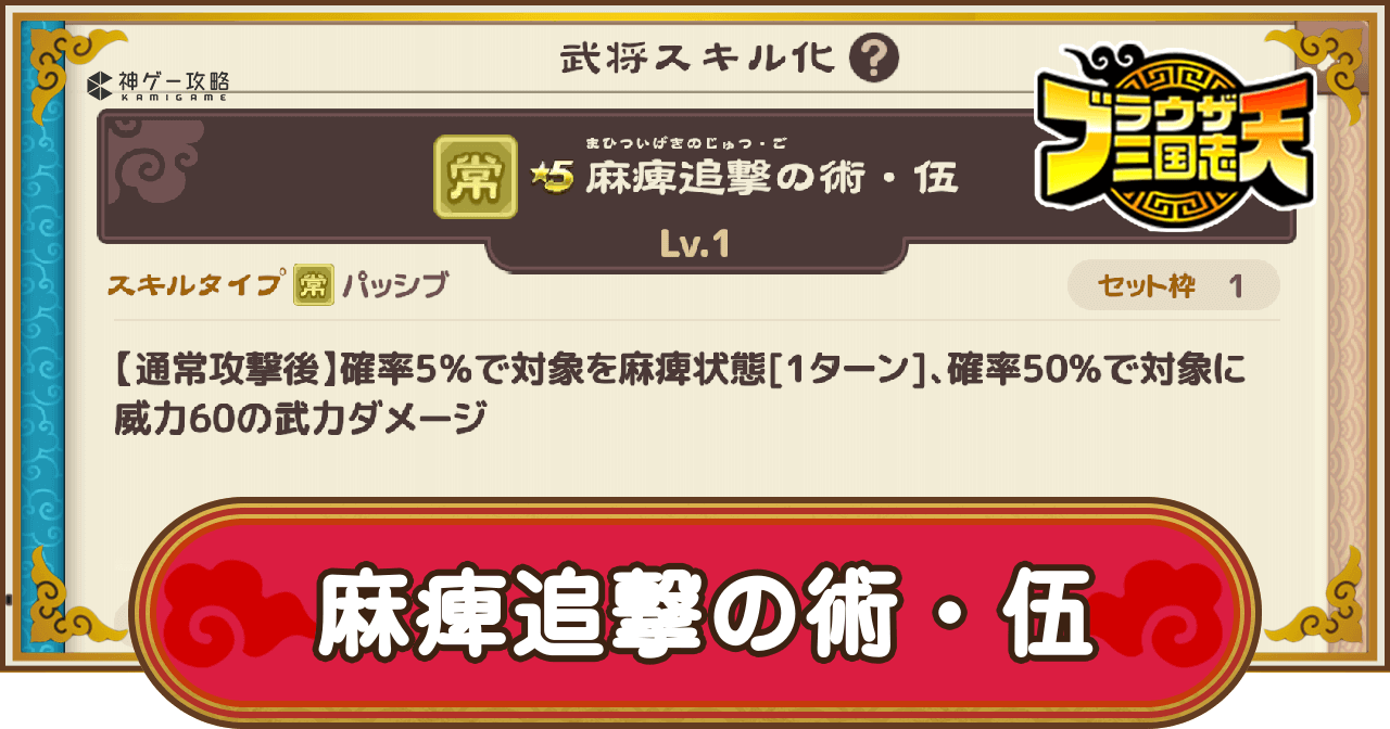 麻痺追撃の術・伍は、低確率で対象1体を麻痺にさせ動きを封じるスキルだ。さらに、50%の確率で武力ダメージを与えるので武力が高い武将と相性良い。