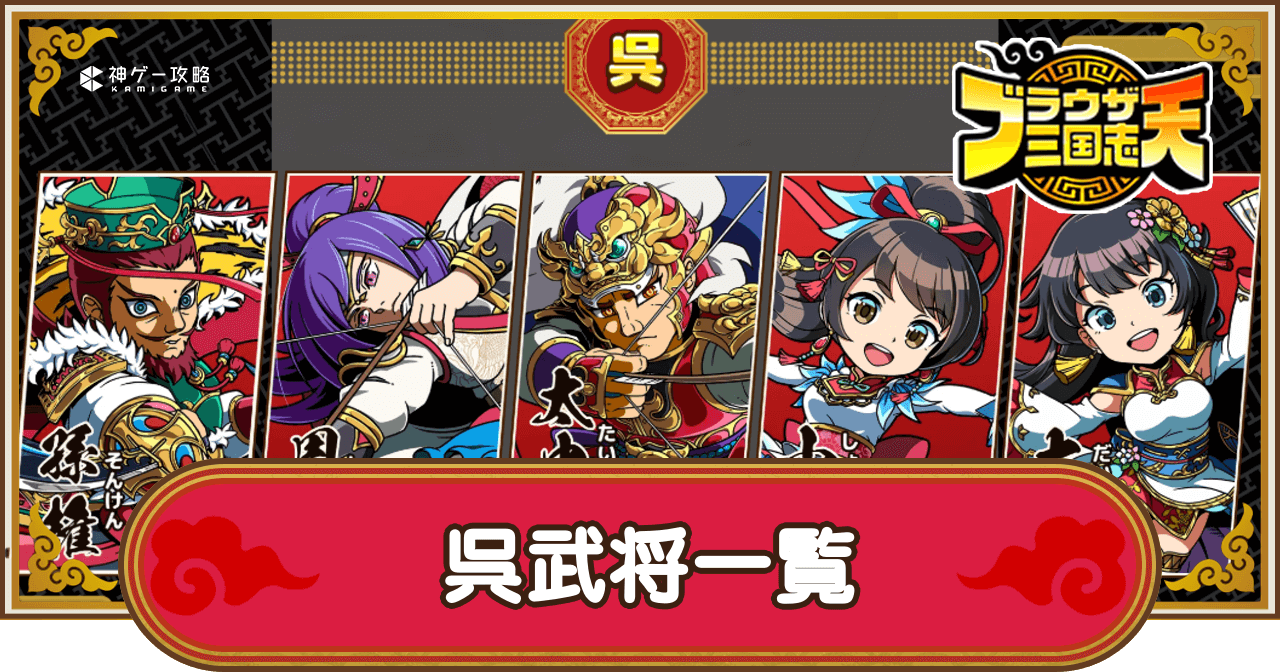 ブラウザ三国志天(ブラ天)の呉武将一覧と呉陣営指南所の効果を紹介。呉の武将一覧や、呉陣営指南所の効果についても掲載しているため、ブラウザ三国志天で呉武将一覧と呉陣営指南所の効果を調べる際の参考にどうぞ。