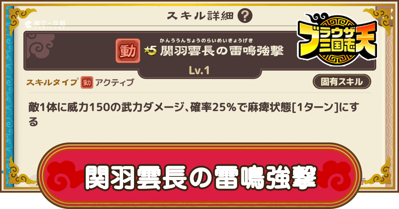 ブラウザ三国志天(ブラ天)の関羽雲長の雷鳴強撃の効果と所持武将を掲載。詳細な効果はもちろん、固有スキルやスキル化で所持している武将についても掲載しているため、ブラウザ三国志天で関羽雲長の雷鳴強撃について知りたい時の参考にどうぞ。