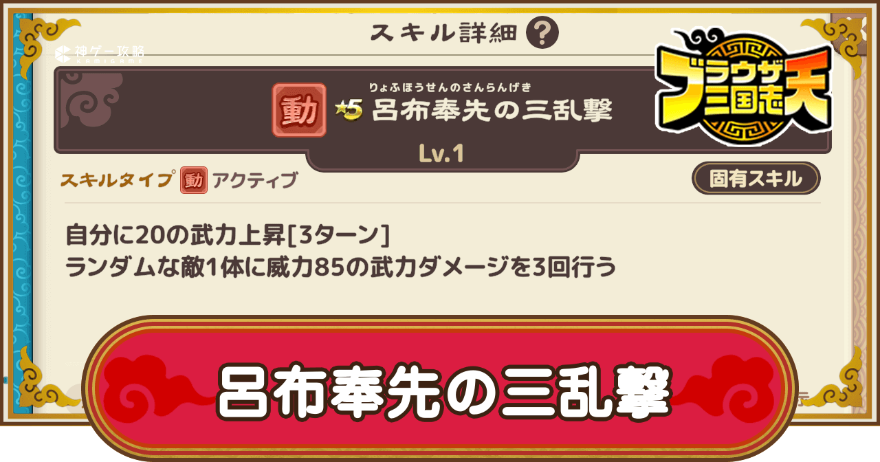 ブラウザ三国志天(ブラ天)の呂布奉先の三乱撃の効果と所持武将を掲載。詳細な効果はもちろん、固有スキルやスキル化で所持している武将についても掲載しているため、ブラウザ三国志天で呂布奉先の三乱撃について知りたい時の参考にどうぞ。