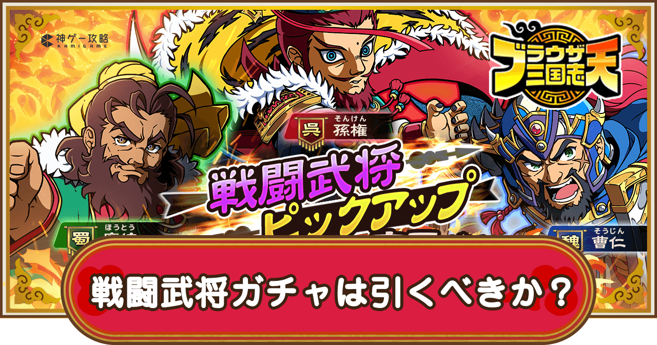 ブラウザ三国志天(ブラ天)の戦闘武将PU宝玉ガチャは引くべきか?を紹介。戦闘武将ピックアップガチャで狙うべき武将や、ガチャの開催期間についても掲載しているため、ブラウザ三国志天で戦闘武将PU宝玉ガチャを引くべきかについて知りたい際の参考にどうぞ。