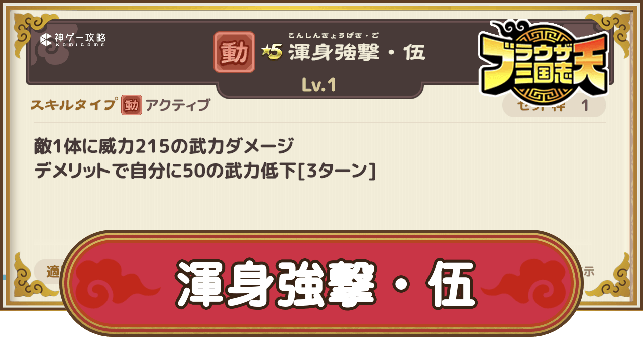 渾身強撃・伍は、最大で430の武力ダメージを与えるスキルだ。デメリットで武力を100下げる効果が3ターン継続するため、強力なバフを持つ武将にセットするのがおすすめだ。武力の低下分をバフスキルで補いながら運用しよう。