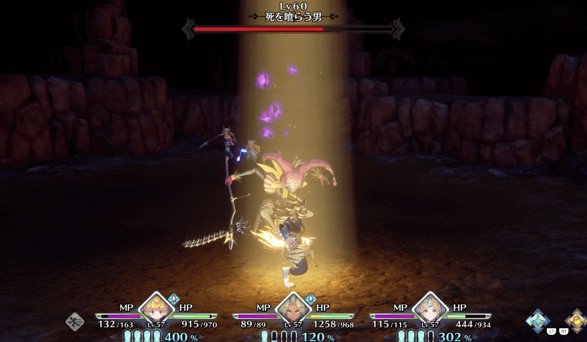 死を喰らう男は、自身の分身を作り出して戦う。分身は本体と同じように各属性の魔法を使用してくる。分身を放っておくと囲まれた状態で魔法攻撃を食らってしまう。そのため、分身が出現したら優先して倒そう。