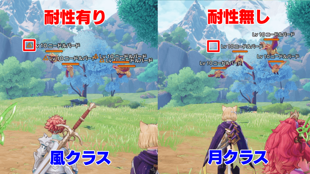 装備している精霊器のクラスによって、戦闘前に属性相性を判別可能だ。弱点の場合はチェックマーク、耐性がある場合は△、無効の場合は×が敵の名前の左側に表示される。