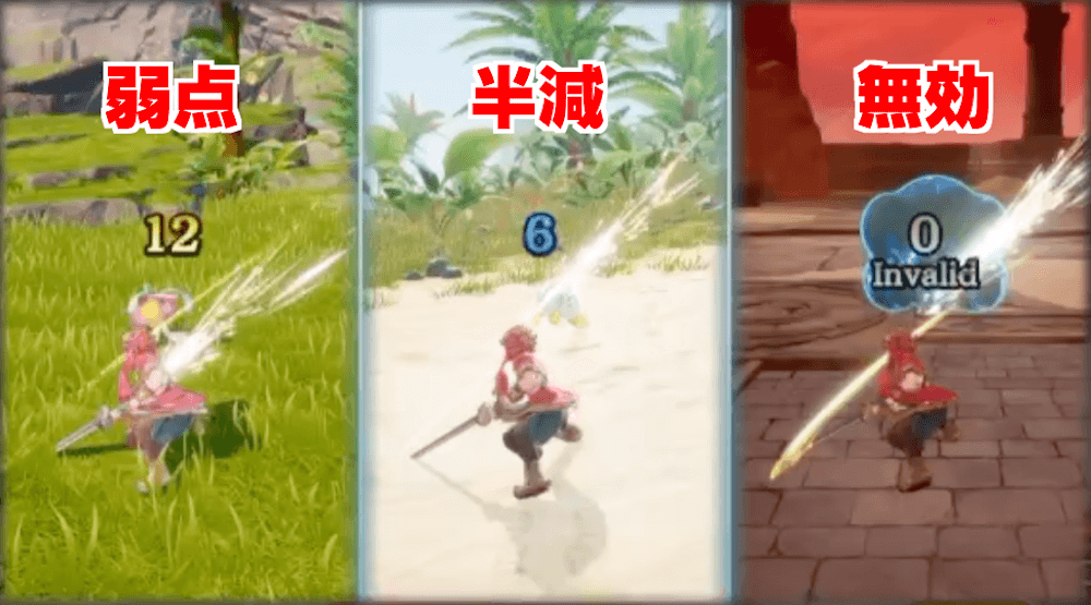 属性相性のある敵に対しては、攻撃した際のダメージが増減する。弱点のある敵には通常よりも大きなダメージを与えられるが、半減の敵にはダメージが半減し、無効の敵はダメージが0になってしまう。