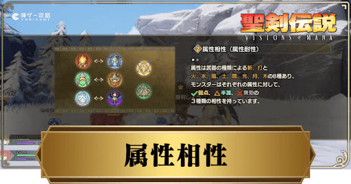 聖剣伝説VISIONS of MANA(ビジョンズオブマナ/VoM)の属性相性を解説。属性の相性に加え、属性の解放条件についても掲載しているので、聖剣VoMをプレイする際の参考にどうぞ。