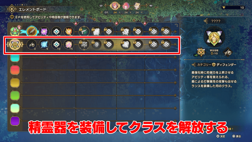 属性を解放するには、精霊器を装備して新たなクラスを解放しよう。また、エレメントボードでEPを使用して精霊器のアビリティや特技を習得すると、クラスに加えて魔法に応じた属性を使用可能になる。
