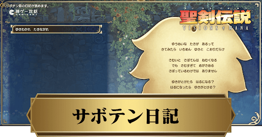 聖剣伝説VISIONS of MANA(ビジョンズオブマナ/VoM)のサボテン日記を解説。サボテン日記の入手場所を大陸別と日記順で掲載しているほか、サボテン君のご褒美の効果やコンプリート報酬も掲載しているので、聖剣VoMをプレイする際の参考にどうぞ。