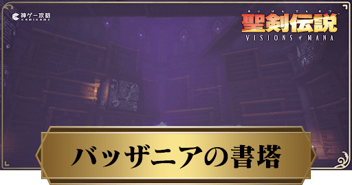 聖剣伝説VISIONS of MANA(ビジョンズオブマナ/VoM)のマップ「バッザニアの書塔」を解説。宝箱や精霊石、サイドクエストやサボテン君 、クマミツやゴールドクローバー、蝶やネームドモンスターの場所も掲載しているので、聖剣VoMをプレイする際の参考にどうぞ。