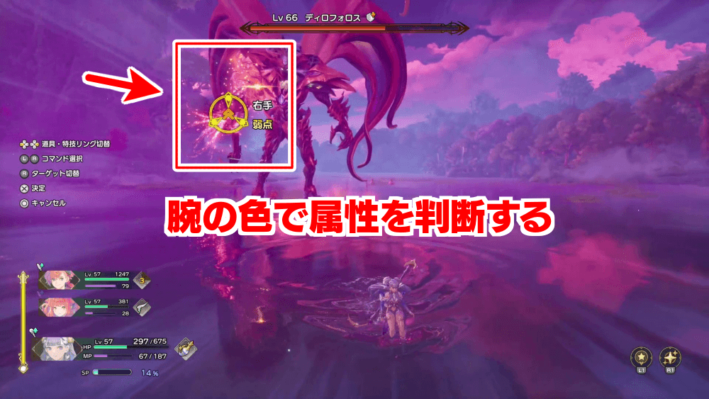 ディロフォロスは右手が弱点部位で、腕の属性によって弱点属性が変化する。色から腕の属性を推測し、弱点となる属性で攻撃しよう。また、特技リングから魔法を選択すると、選択した魔法が弱点かどうかを確認できるため、弱点がわからない場合は特技リングから魔法を選択してみよう。