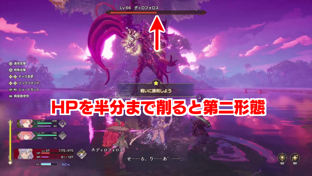 「最終決戦に挑む」を選ぶと、ラスボス「ディロフォロス」との戦闘になる。ディロフォロスは時間経過によって属性が変化するため、なるべく多くの属性で攻撃できる準備をしてから最終決戦に挑もう。ディロフォロスを倒すとエンディングが流れ、ゲームクリアとなる。