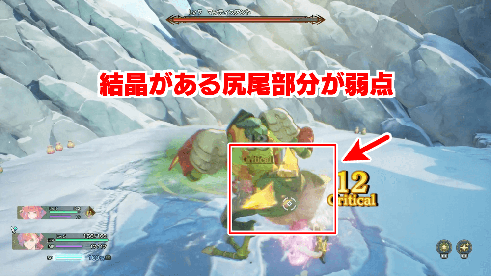 マンティスアントは、黄色い結晶が付いている尻尾のように見える腹部が弱点なので、腹を集中して狙おう。後ろに回り込めば攻撃も当たりにくいため、効率よくダメージを与えつつ被ダメージも抑えやすい。