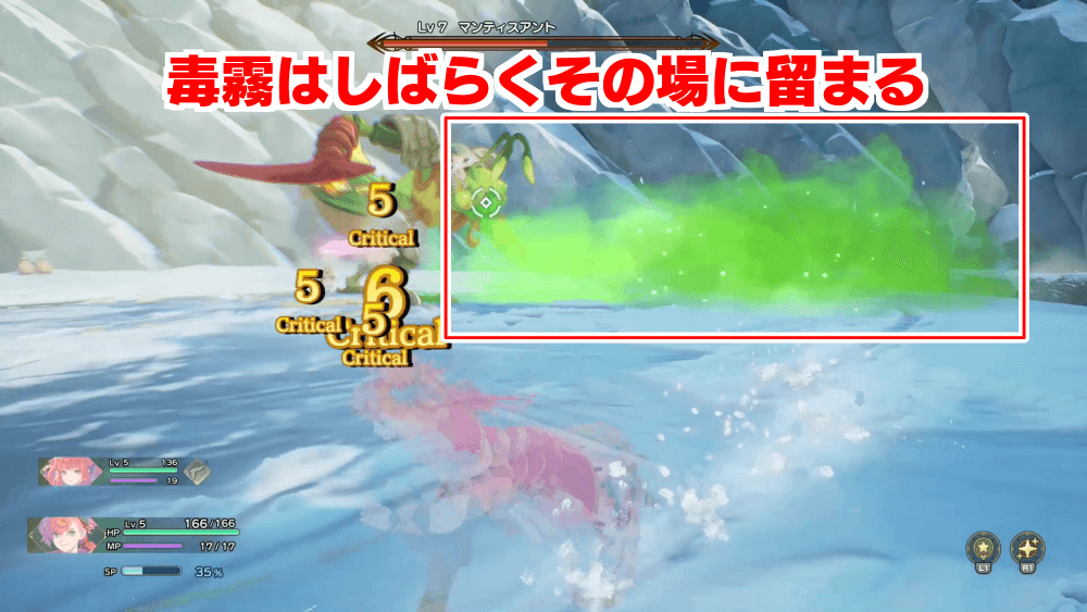 マンティスアントが出す毒の霧は、一定時間その場に留まるため、近づかないように注意しよう。毒状態になると継続ダメージを受けてしまうので、毒を受けた場合はプイプイ草を使って状態異常を回復すると良い。