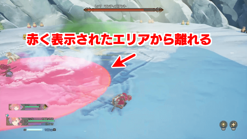 マンティスアントがジャンプ攻撃を仕掛けてくる際、着地点が赤く表示されるので、地面が赤くなったら急いでその場を離れよう。素早く移動する場合は、回避かダッシュを使うのがおすすめだ。