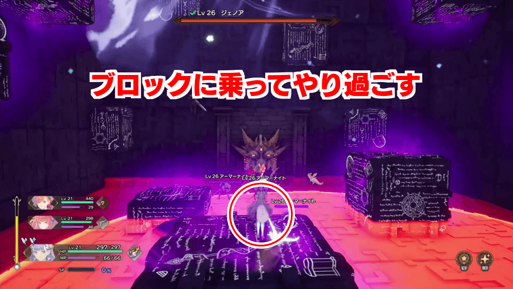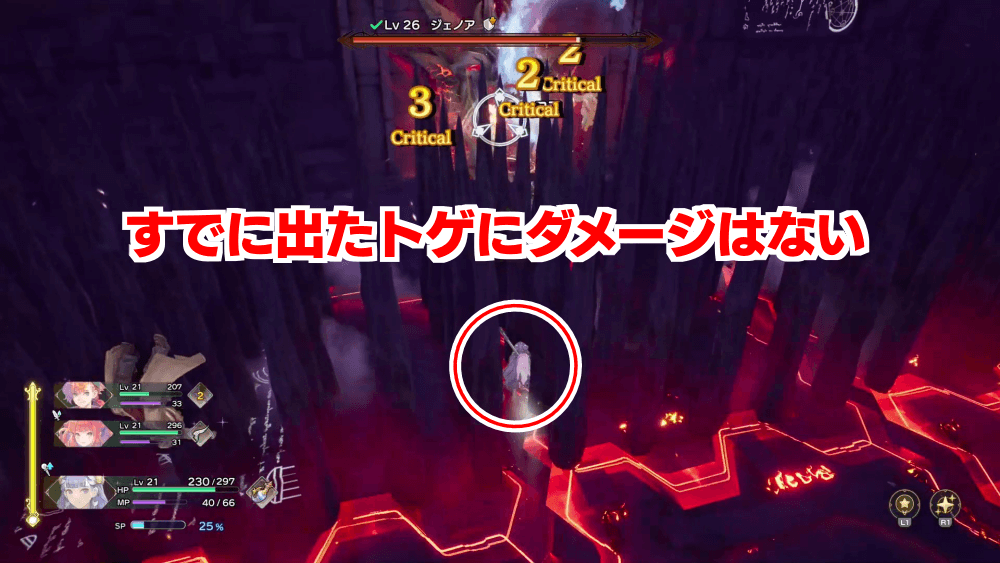 ジェノアは広範囲に床からトゲを出す攻撃をしてくるので、足元が赤く光ったら移動して回避しよう。一度出たトゲには当たってもダメージはないので、トゲに向かって回避すると避けやすい。